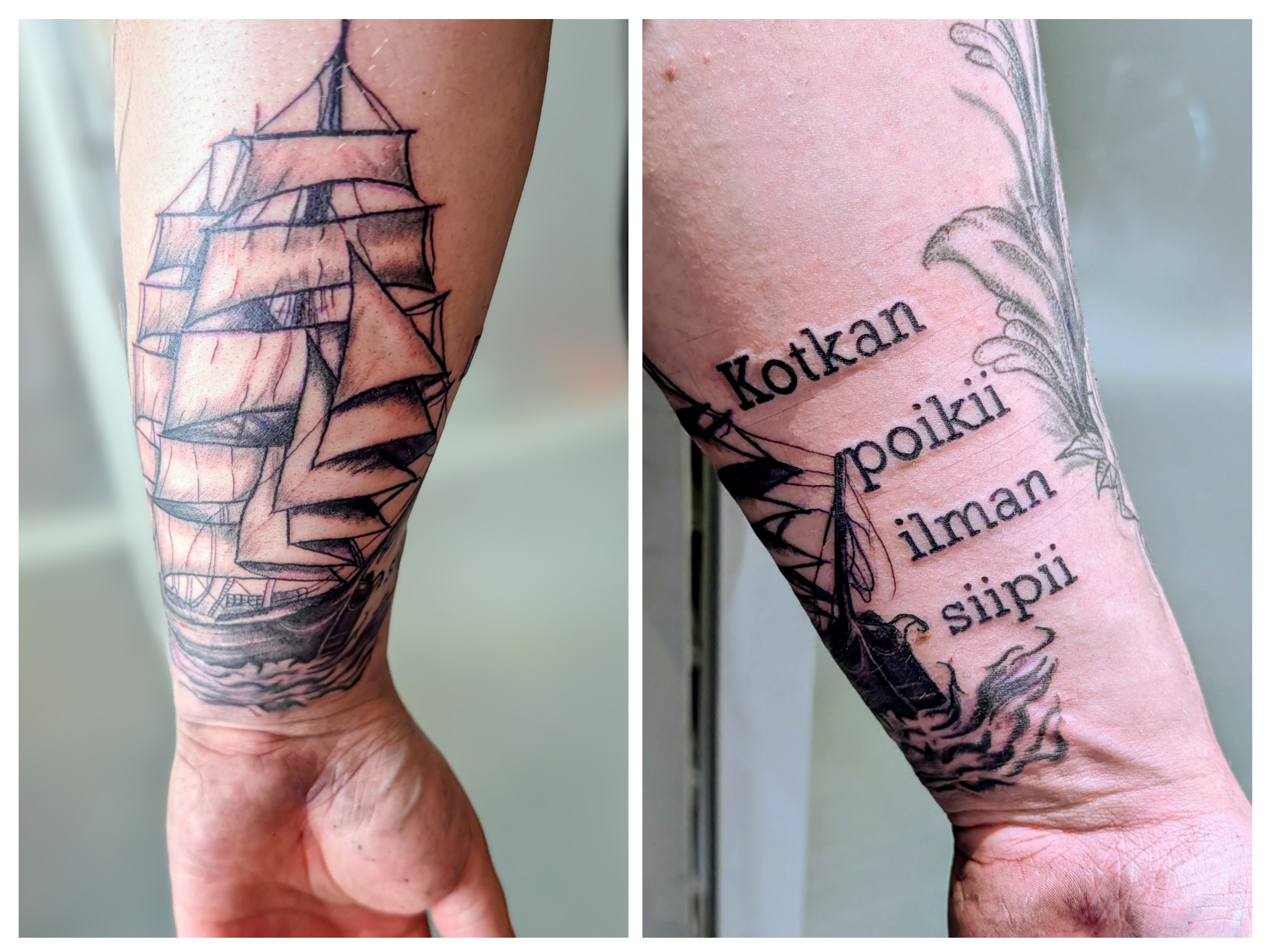 Tuore tatuointi voi olla arka, punoittava tai turvonnut. Puhdista tatuointi 1–2 kertaa päivässä ja käytä hoitovoidetta aina pesun jälkeen vähintään kahden viikon ajan. Voit rasvata useammin, jos iho tuntuu kuivalta tai kiristävältä. Jatka kosteutusta säännöllisesti koko ensimmäisen kuukauden ajan. Kelmua voi käyttää tarvittaessa, jos vaatteet hankaavat ihoa, mutta muista puhdistaa ja rasvata iho aina ennen sen laittamista.